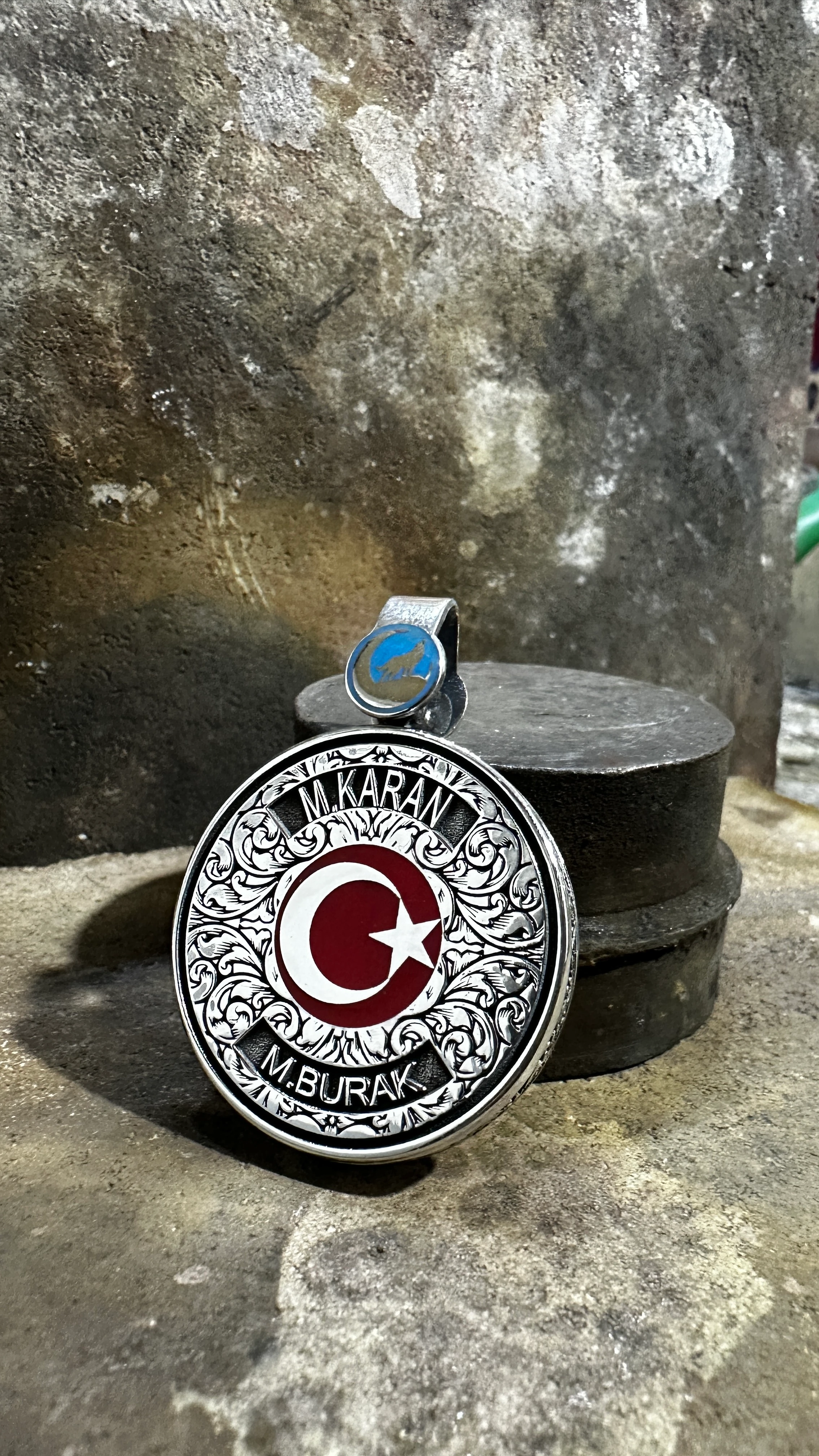 İkinci Kısım : El İşi gravür desenlerle beraber kırmızı renk mine sanatı ile ay yıldız işlemesi yapılmış olup üst ve altı kısma isim işlemesi yapılmıştır. Zincir Halkasına Turkuaz renk mine sanatı ile hilal içinde bozkurt işlemesi yapılmıştır.